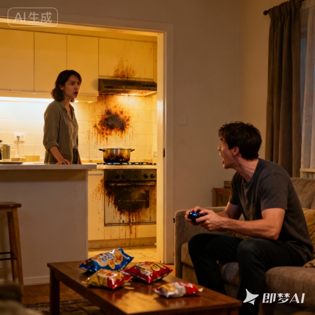 某一天晚上,小周闻到了厨房传来的焦糊味。她冲进去,发现炉子上的汤锅已经烧得发黑,而她的丈夫就坐在客厅打着游戏。